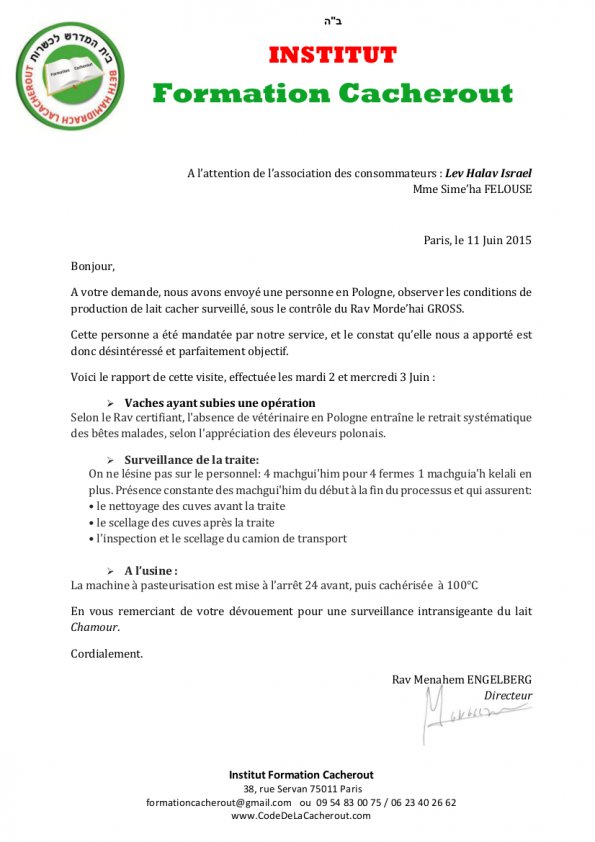 Nous avons été mandaté par l'association Lev 'Halav Israël pour inspecter la production laitière sous la surveillance de la CAR (Chambre Arbitrale Rabbinique) du Rav Mordekhaï Gross.