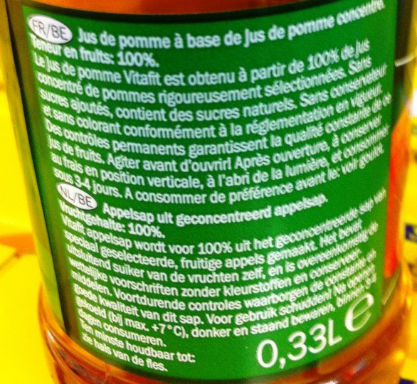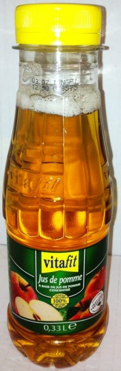 Le jus de pomme de la marque VITAFIT a de grands risques de contenir du sucre à base de jus de raisin, comme on peut le voir dans la composition. En effet, celle-ci atteste qu’il s’agit d’un jus de pomme à base de concentré dont la teneur en fruits est de 100%, et contient du sucre naturel, sans préciser s’il s’agit de sucre naturellement présent dans le fruit (la pomme). En général, les sucres naturels utilisés pour la fabrication de jus de fruits proviennent jus de raisin, ce qui explique la forte possibilité pour ce jus de contenir du jus de raisin.