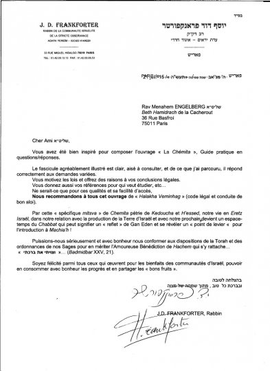APPROBATION DU RAV Y.D FRANKFORTER - Pour le guide pratique des lois de Chmita